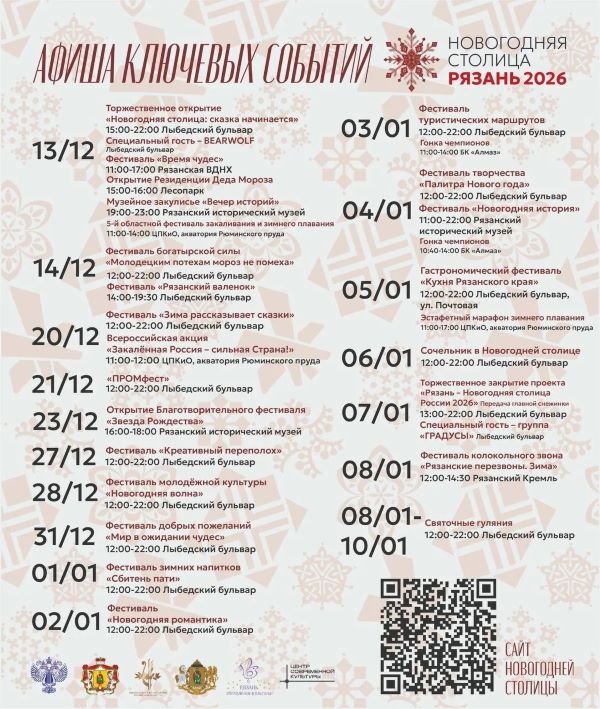 С 13 декабря по 10 января Рязань превратится в сказочную декорацию - город станет новогодней столицей России. Весь город - одна большая сцена. Фестивали ледяных скульптур, гастрономические ярмарки и резиденции сказочных героев. Но главный символ новогодней столицы-2026 - Снежанушка. Это дочка Снегурочки - самая доброжелательная и трудолюбивая снежинка, превратившаяся в девочку.